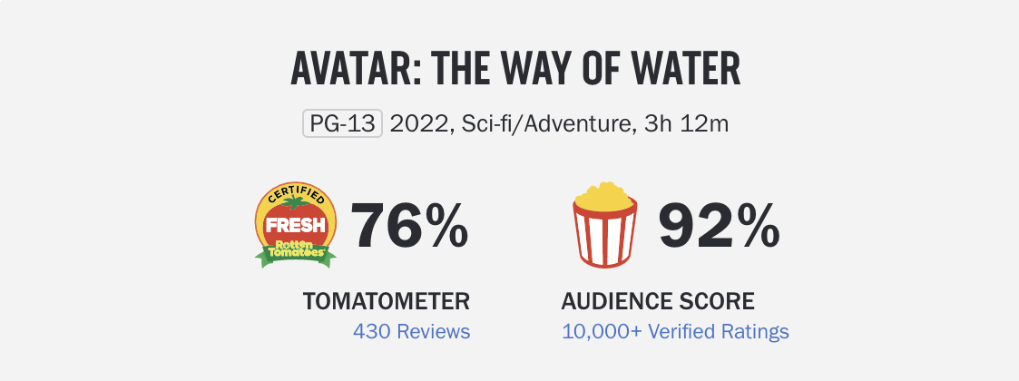 I have to be honest, at first I was nervous to watch this film. I wasn’t sure how they were going to continue without the storyline of having Jake as an avatar, and that conflict between humans and the world of Pandora. But- they did it! This three hour film was utterly amazing to watch. I definitely recommend watching the first Avatar film before watching this one, as there are many recurring characters and references. The CGI of the Na’vi was beautifully done, and even without being human, you could tell and see the talent and acting behind these actors. Each scene was honestly beautiful to watch, just cinematography wise, because of the beautiful colors, compositions, and more. The visual effects were astonishing, and really set a new high standard for all future movies with visual effects. I also LOVED the family theme throughout the entire movie. The focus of protecting your family, no matter what, and even sacrificing everything for them was just beautiful. But, this theme could be seen as cliqué, especially after three hours. Personally, I thought it was a strong theme for such a beautiful film. I STRONGLY recommend watching this movie. It really is an immersive, beautiful experience and world you are thrown into as a viewer. I definitely enjoyed it more than others out there, so read on to see what other reviewer’s thought too.