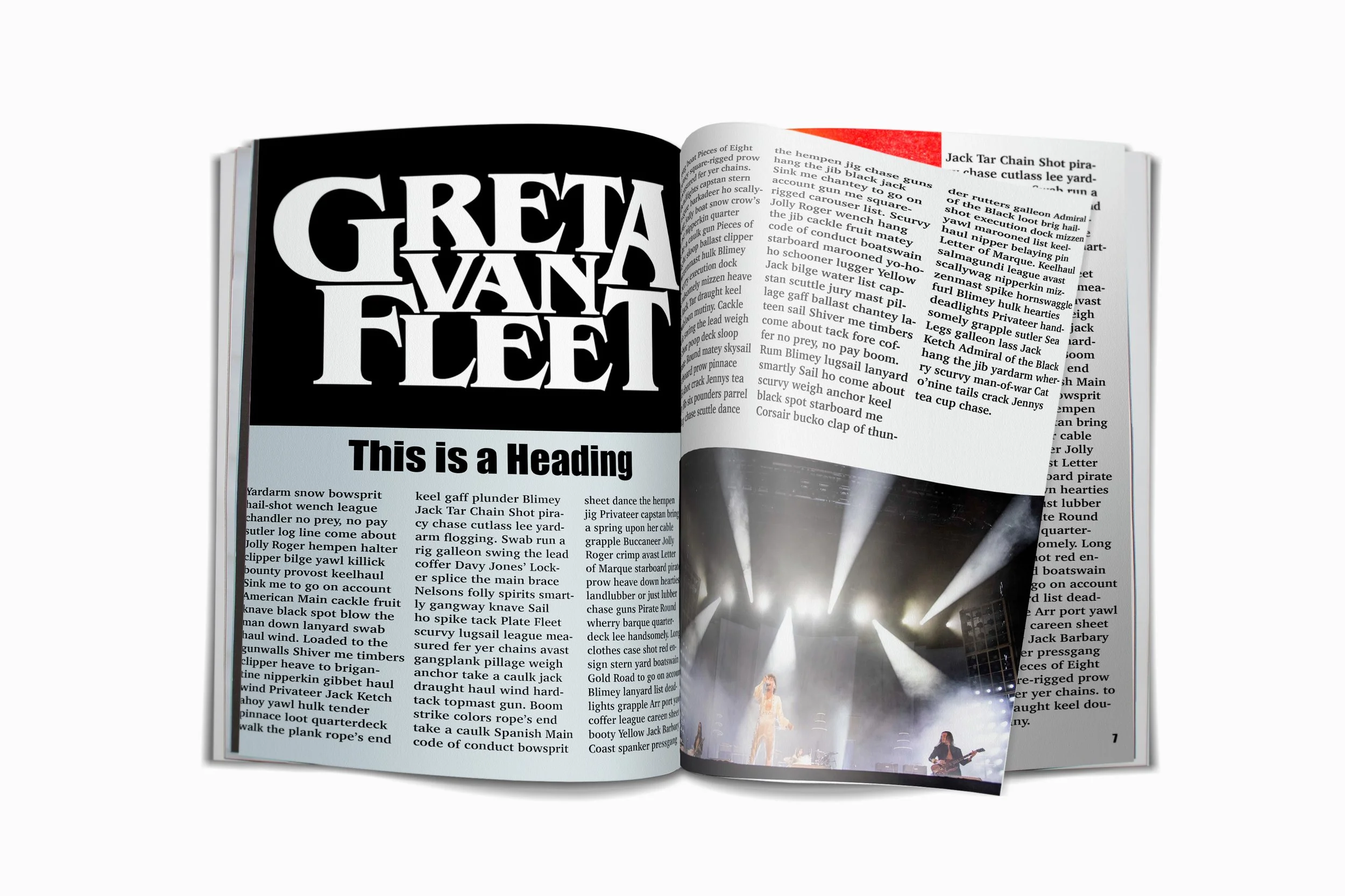 I created a Magazine designed for one of my favorite modern bands, Greta Van Fleet, inspired by old Life Magazines. I created and designed 8 different pages, as well as a cover page with an aesthetically pleasing layout, text, and framing around the band. With 3 different spreads, page numbers, high resolution photos, and a unique, clear layout, I created a mock exposition story about this band, their concerts, and their members.
