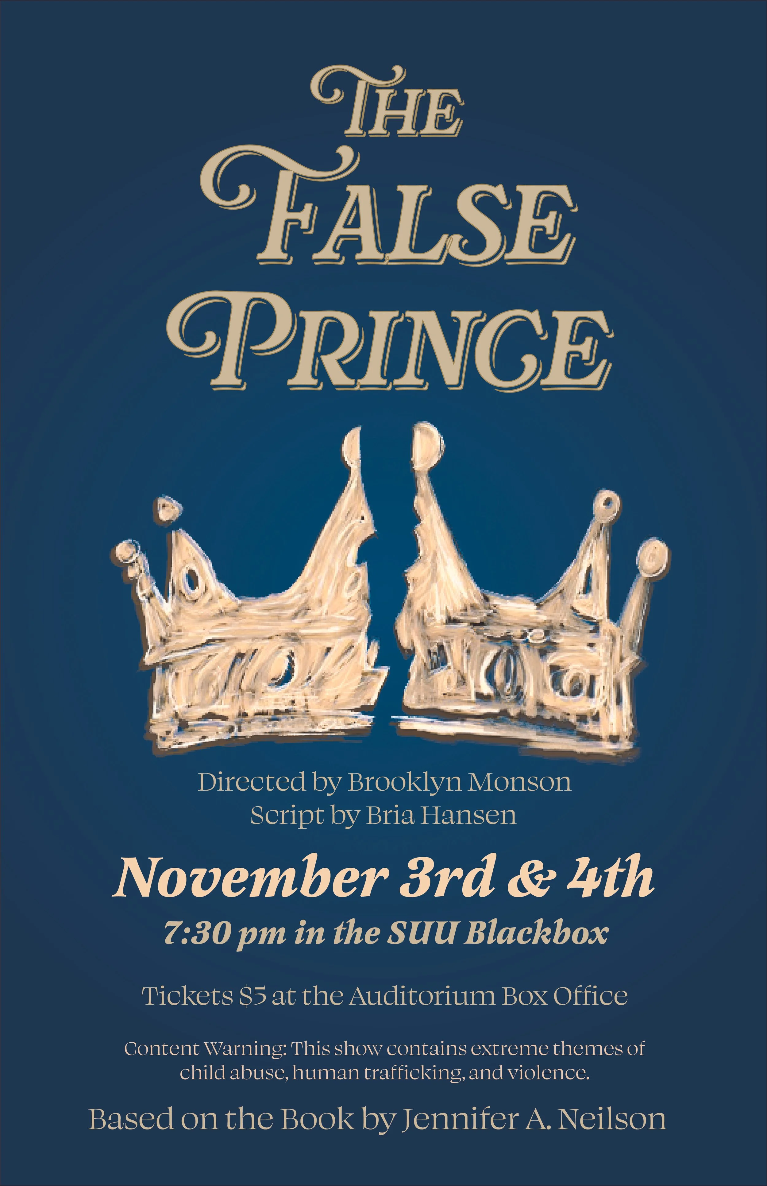 In Fall 2023, I had the privilege of directing an original play adaptation of The False Prince by Jennifer A. Nielsen at Southern Utah University. In addition to directing, I took on the challenge of designing the poster and creating a marketing campaign for the production.