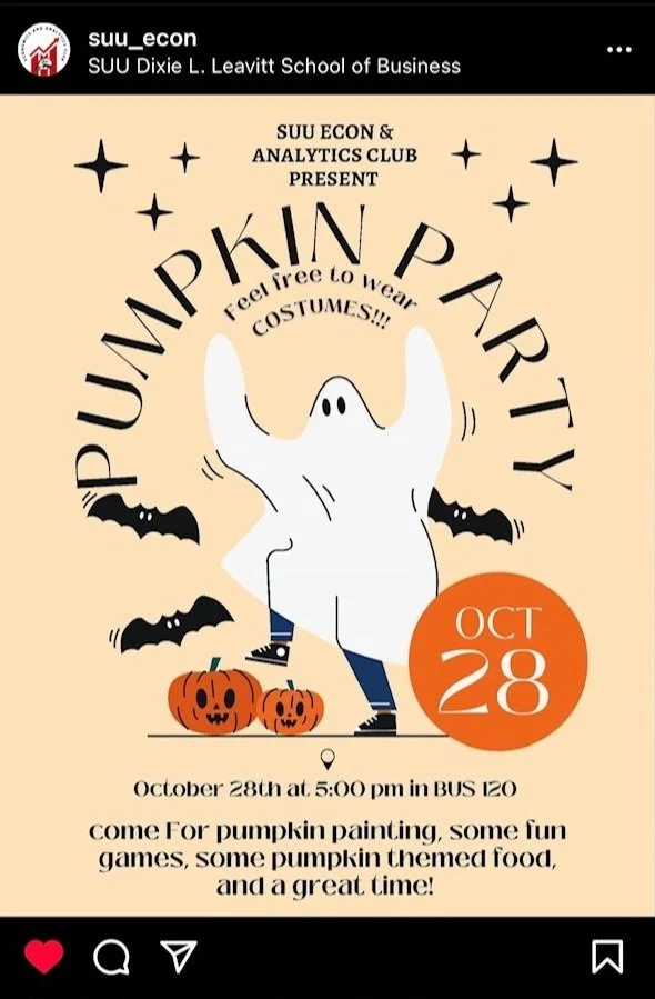 As VP of Communications for SUU’s Econ & Analytics Club, I created social media content about events. Here are a few examples.